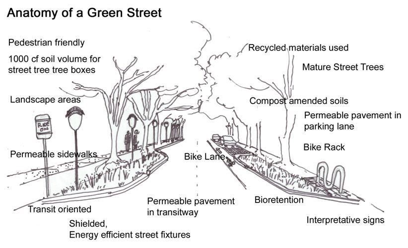 Green streets help make communities more resilient to extreme weather and other climate effects. Specifically, green streets aim to more adequately manage storm water by reducing the amount of impermeable surface, such as asphalt, that is present in a given area. Green streets protect water quality in rivers and streams by removing up to 90% of pollutants. They replenish groundwater supplies, absorb carbon, improve air quality and neighborhood aesthetics, and provide green connections between parks and open space. Vegetated curb extensions improve pedestrian and bicycle safety, and calm traffic. The implementation of green streets principles could help mitigate the impacts of climate change while protecting natural resources and infrastructure investments as an integral part of complete streets designs.