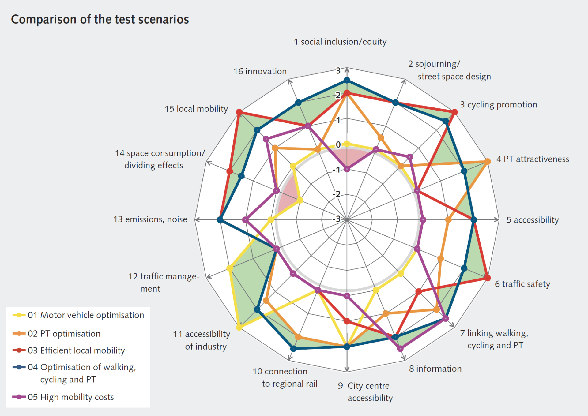 The Bremen Urban Mobility Plan used 16 target indicators for the qualitative comparison of packages of measure for the five test scenarios that had been developed. This enabled a goal-focussed comparison of the impacts of the test scenarios. Using these indicators, it was possible for each test scenario, to identify the strengths with regard to the degree of achievement of the scenario and its package of measures.