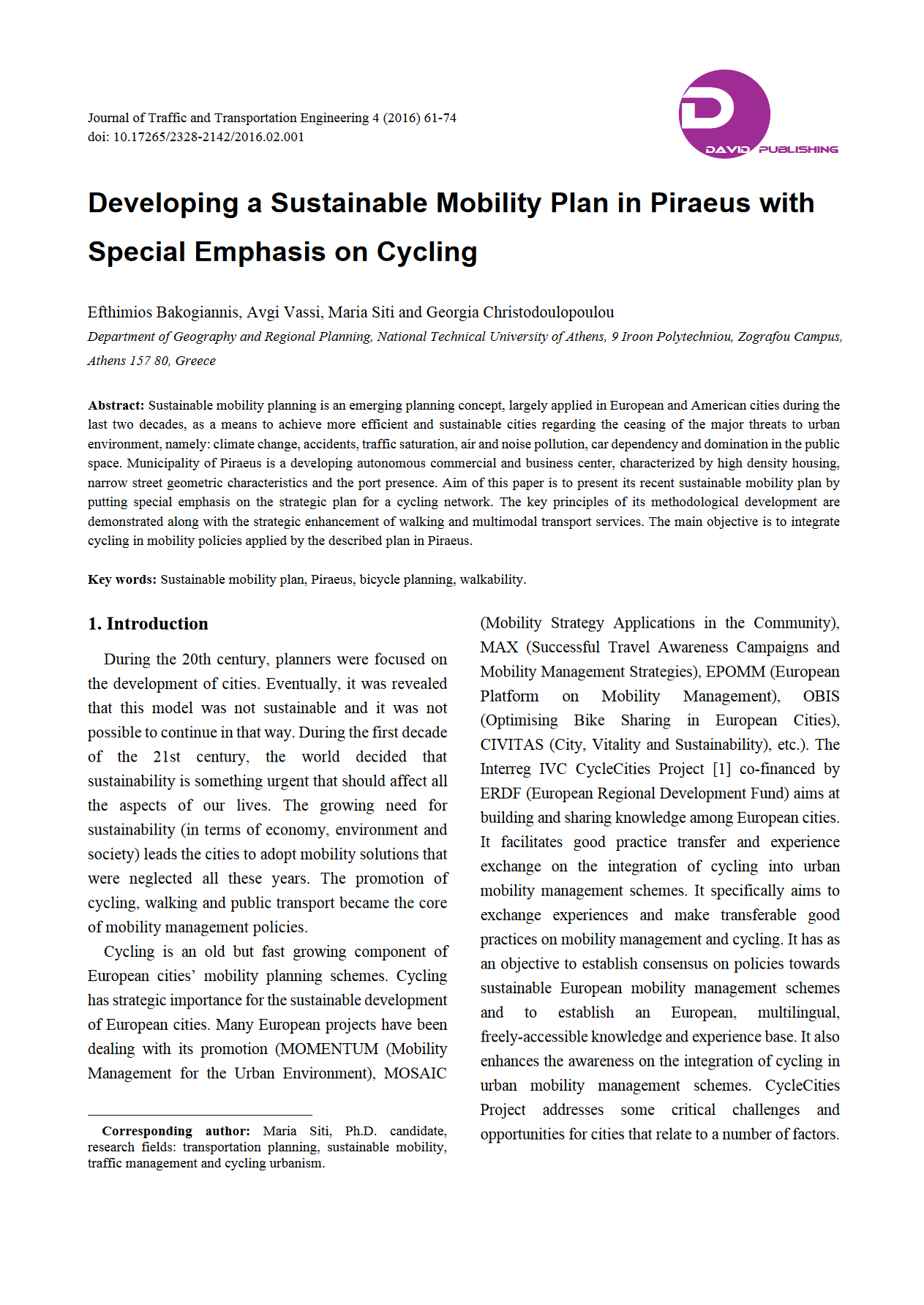 Developing a Sustainable Mobility Plan in Piraeus with Special Emphasis on Cycling. The plan described in this paper demanded an in-depth analysis of the existing situation and a strong support from the participatory procedures, as Piraeus was considered a “beginner” not only in cycling but in sustainable mobility. The principal aim of the study was to propose a plan, adapted to the social and physical features of the City of Piraeus. Along with the exploration and analysis of the existing situation, the study used a bottom-up approach that involved residents and visitors of the City of Piraeus, not only by integrating their views and desires for the city but also by encouraging them to choose among alternative mobility policy solutions. Based on the findings of the analysis of the existing situation, different scenarios were proposed. The scenarios represented each of the “possible futures of the city”, based on mobility choices. The most desired scenario was selected based on participation of residents, visitors, the municipality and stakeholders.