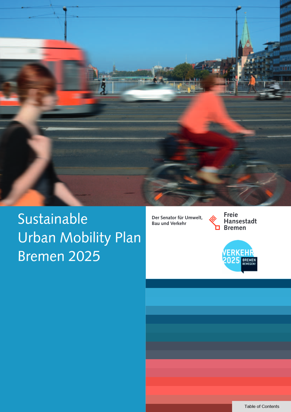 The Sustainable Urban Mobility Plan Bremen 2025 has been published in English and it received the European SUMP Award. It is designed to ensure well-functioning and environmentally-friendly mobility in Bremen. It aims to increase social inclusion, improve safety, optimise accessibility, provide more and better services for environmentally-friendly modes of transport, improve connectivity between transport systems including walking, cycling and public transport and improve health and the environment. The reason for selecting this Urban Mobility plan is the very extensive attention that has been given to developing five alternative urban mobility improvement scenarios. These were thoroughly evaluated against 16 target indicators to assess the extent to which they achieved the goals. The results show which measures should be included in the target scenario which became the basis for preparing the SUMP.