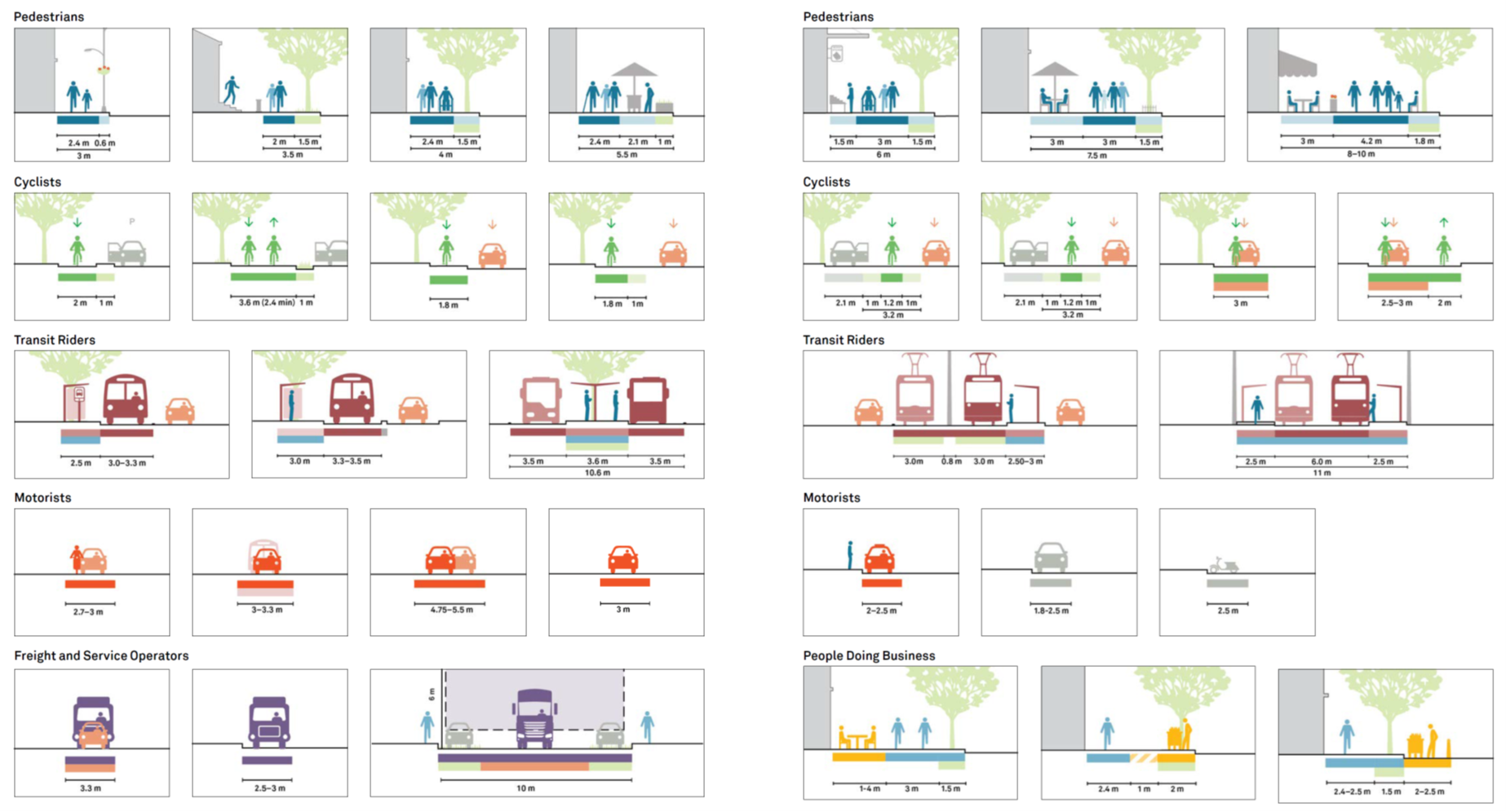The iRAP Star Ratings of NACTO-GDCI's Global Street Design Guide presents a summary chart of the basic street geometry sections has been compiled for various street users. This very useful design guide is presented below (clicking on the image will link to a larger presentation).