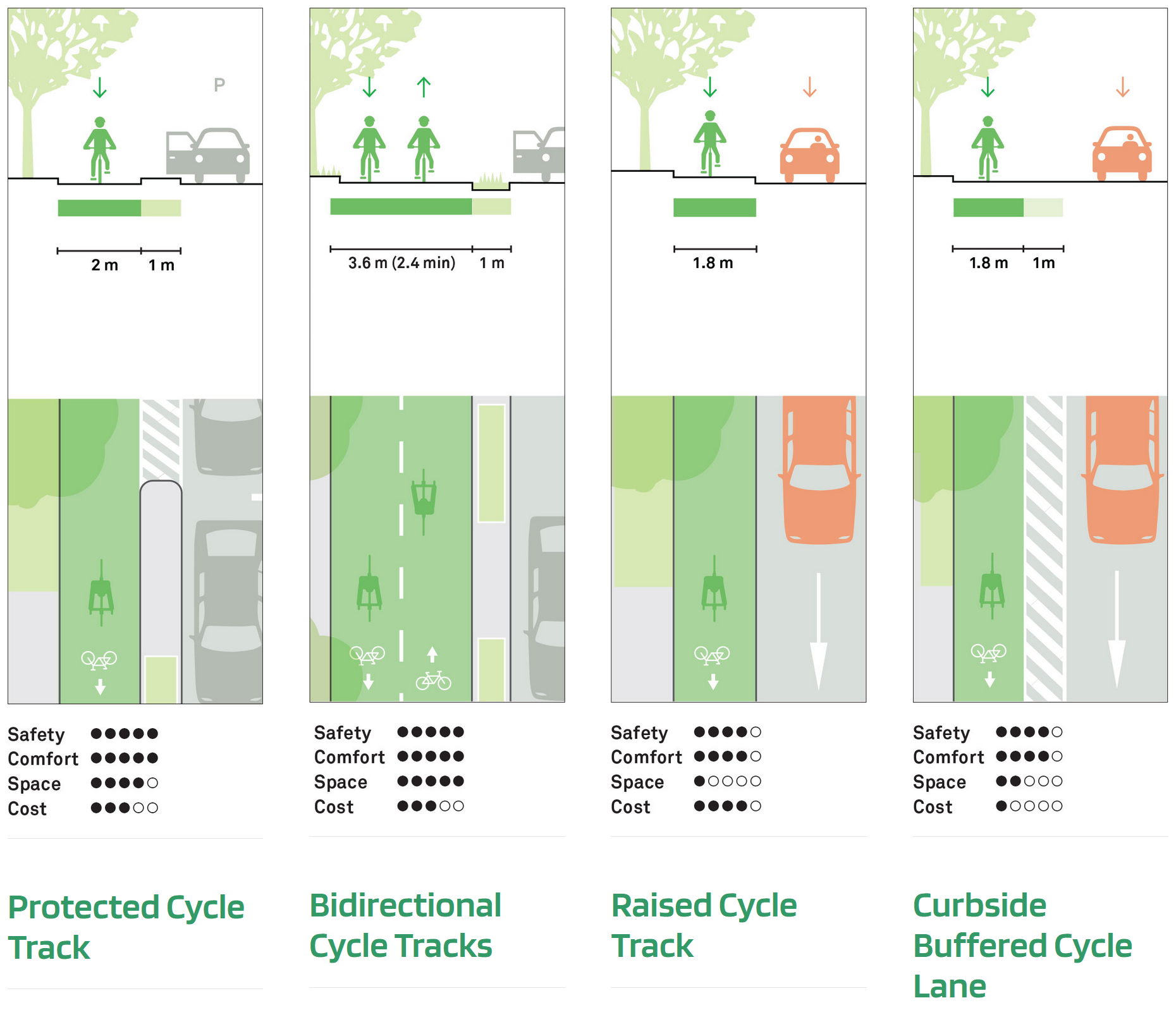 Cycle Tracks are exclusive cycle lanes that are physically separated from motor traffic and distinct from the sidewalks (they can also be independent and considered as a road only for cyclists). They can be one or two way. They provide the highest degree of comfort and safety for cyclists. Protected cycle tracks achieve separation through raised buffers Materials, curbs, or bollards help to identify the space and prevent intrusion by motor vehicles.