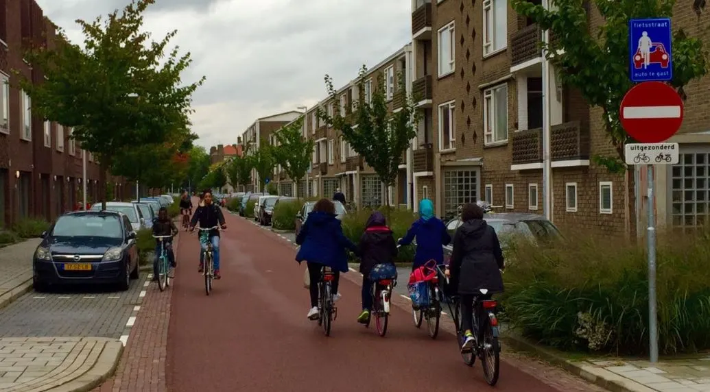 Cycle Streets are a form of mixed-traffic street where the needs of cyclists are prioritised over motor vehicles. Bicycles should be the dominant mode, whilst the number of motor vehicles should be minimised and so cycle streets are most likely to be implemented on through or main cycle routes where motorised traffic requires access to local destinations. Typically it will consist of a cycle track (indicated by colouring and markings) on which motor vehicles are permitted to drive.