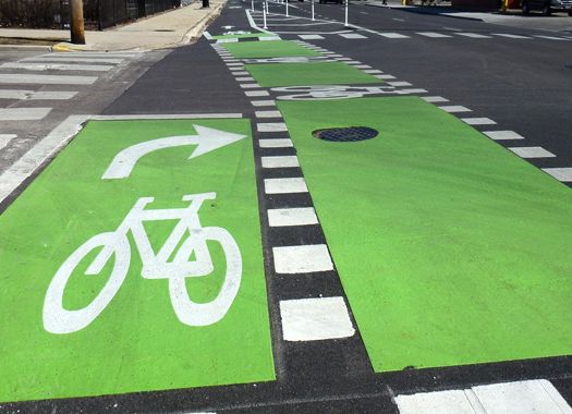 These should be applied to the roadway at cycle crossings (such as intersections, roundabouts, turn lanes, or in front of driveways) with markings that alert drivers and cyclists to potential conflict areas and guide cyclists across intersections. Specific markings vary by location, but these areas should differ visually from the standard lane markings to highlight changing conditions to street users.