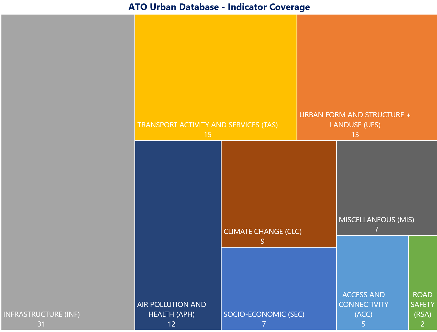 is initiated by the Asian Development Bank (ADB) to strengthen the knowledge base on transport in the Asia-Pacific region. The ATO Urban Database contains indicators on Infrastructure, Urban Form, Structure and Land-use, Activity and Services; Access and Connectivity, Road safety; Air Pollution and Health; Climate Change; Socio-Economic; and Miscellaneous. A detailed assessment on selected 41 urban centres was conducted which provided additional detailed indicators, transport-related targets, and city-level policies. The database is available in Excel format and can be downloaded