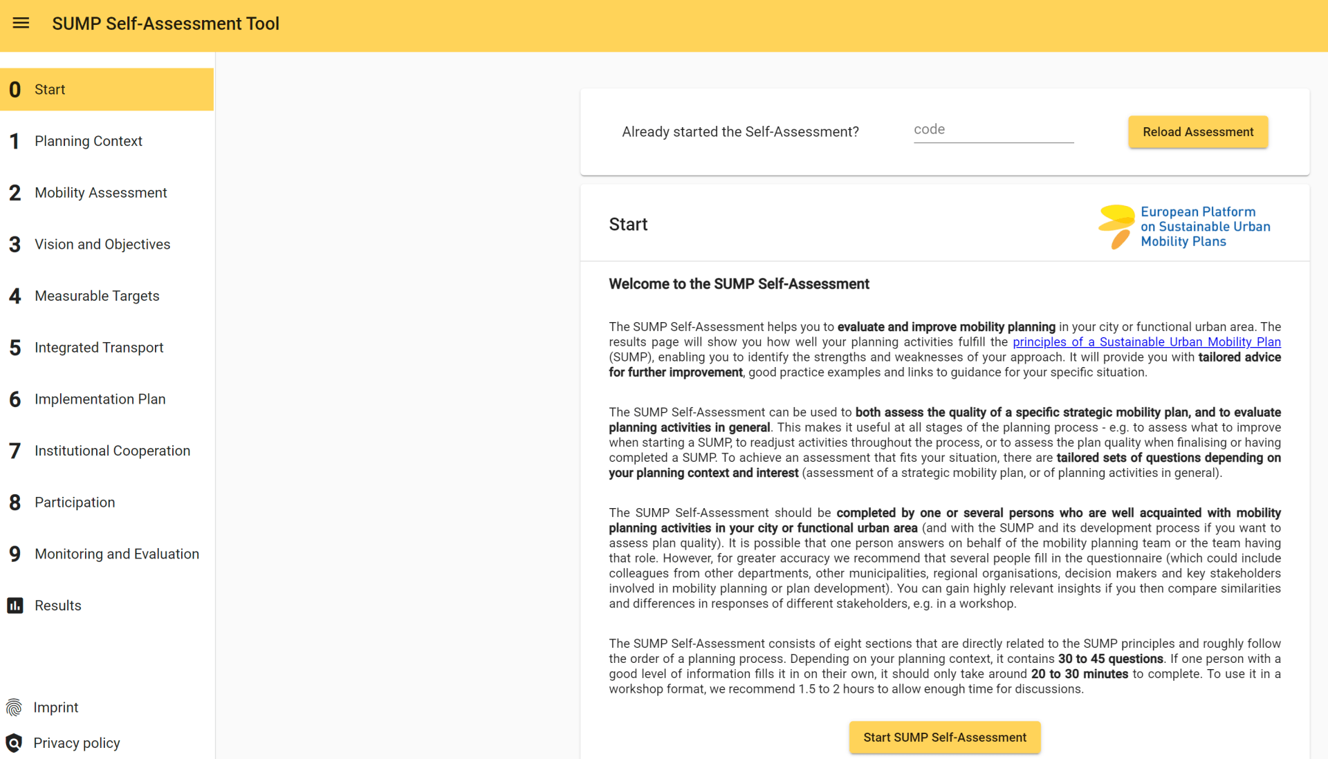 SUMP Self-Assessment Tool that helps to evaluate and improve mobility planning in a city or functional urban area. It can be used to assess the quality of a specific strategic mobility plan and planning activities in general. To achieve an assessment there are tailored sets of questions depending on the planning context and interest (a mobility plan, or planning activities in general).