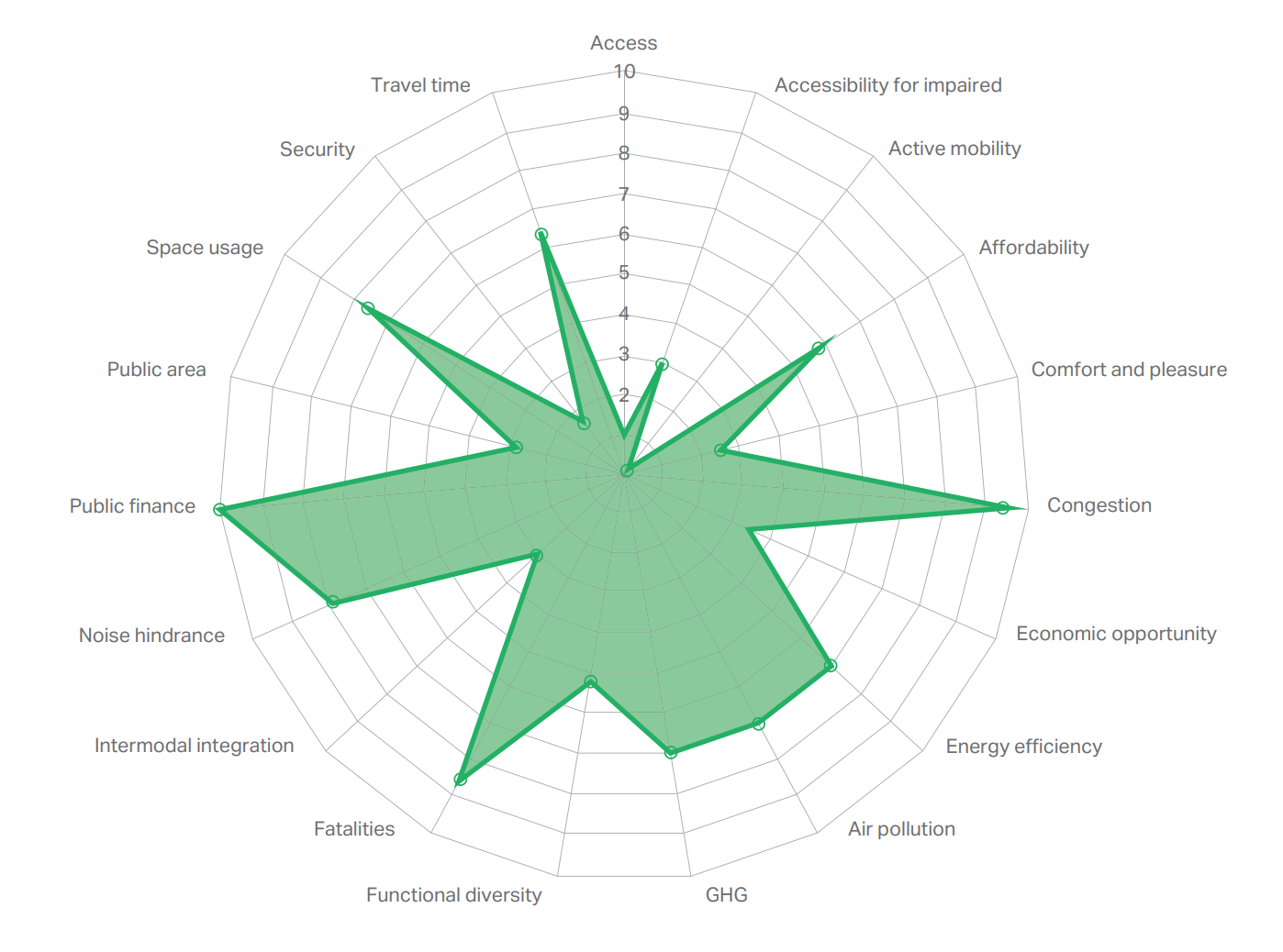 The Institute for Transportation and Development Policy (ITDP) has developed a suite of Indicators for Sustainable Mobility that can be used to effectively develop sustainable transportation policies in a city and to measure their effectiveness. These indicators measure a variety of different aspects of sustainable transit and can be broadly grouped into three categories: proximity, access, and city characteristics. The goal is to provide city officials with the tool necessary to understand transportation conditions and make informed policy interventions that improve sustainable transportation. The indicators developed by ITDP have been tested in 25 cities in North America (Canada, Mexico and the USA) to measure their sustainable transport systems. The indicators are easily understood and replicable, and they rely on open-source data. By using transparent and actionable indicators, the results can be easily communicated to politicians and communities.